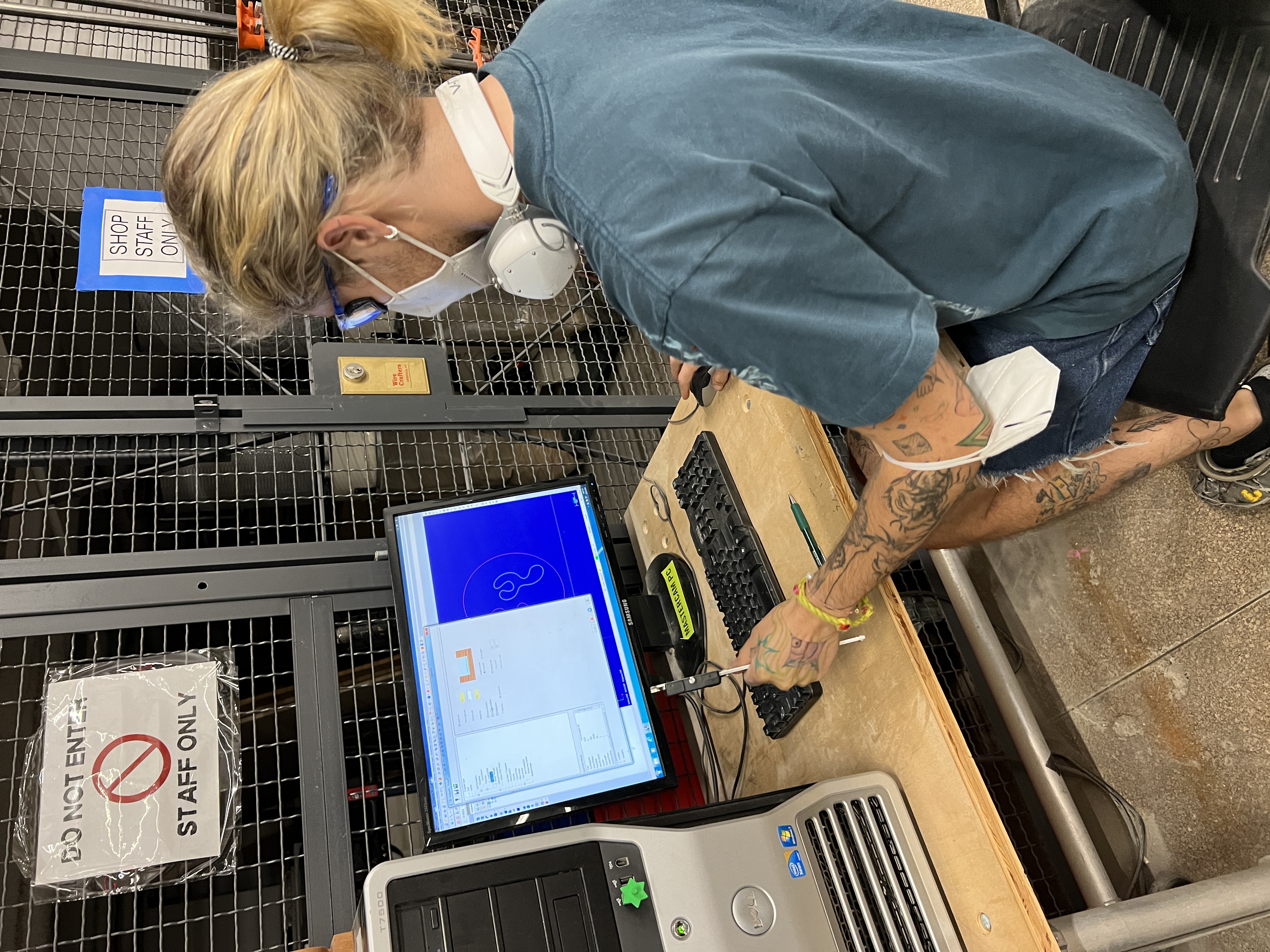 I loooove vaccuuming, very satisfying way to pass this time. And look how powerful it is, sucked my design right up at the end. That pop at the end is pretty scary too. It *was* emphasized in class to use the assistance jig there but I feel it could be stressed in just a couple more words the importance of that near the end of the cut. <3