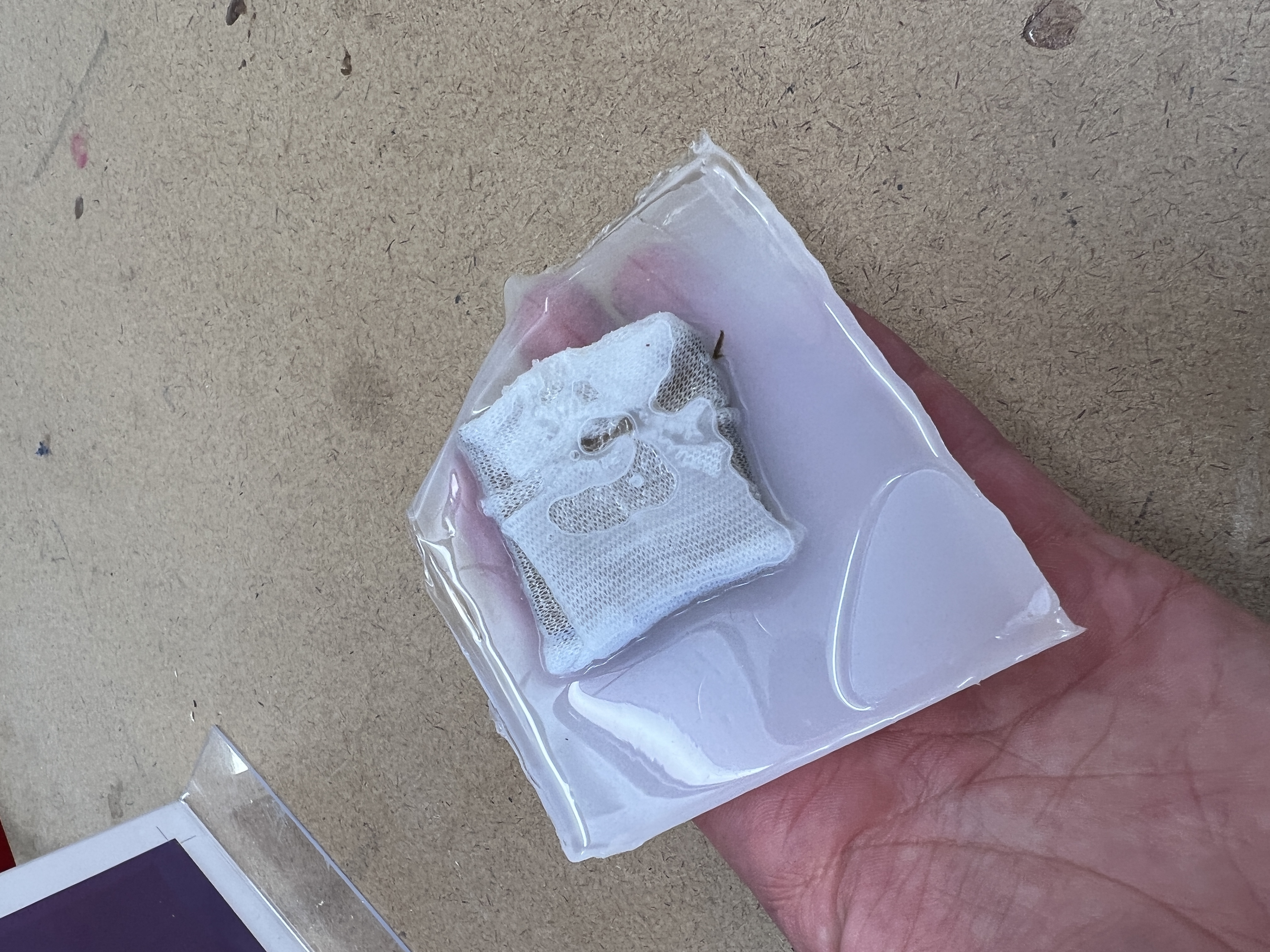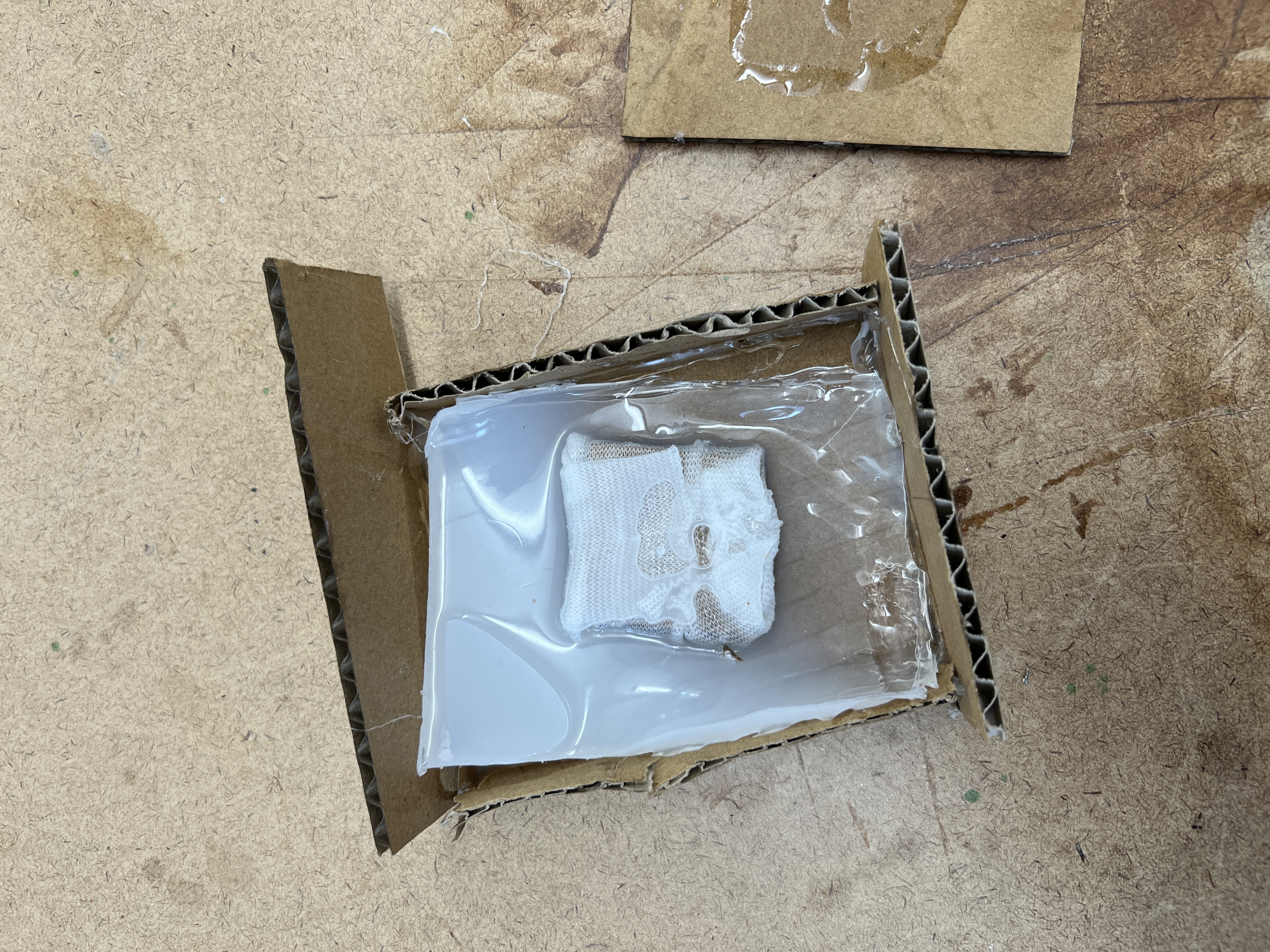 I wanted to see what making a simple square with a pocket in the center would be like. I haphazardly cut some of the cloth to wrap around a thin prism of cardboard that was degassed first and then placed in the whole mold, of which is also cardboard assembled and sealed with hot glue. I poured into the mold over the degassed prism with silicone, and then degassed again. The final layer was pressing that top section of cardboard down to keep the mold both clean, compressed, and hopefully shape it.